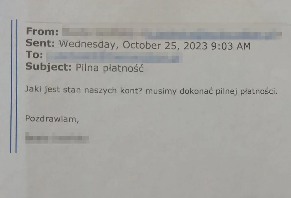 Kiedy sprawca ustalił jaką gotówką spółka dysponuje. przesłał dane do wykonania przelewu. Poprosił o pilną jego realizację i przesłanie potwierdzenia wykonanej dyspozycji. Miała być to kwota ponad 120 tys. zł jako zapłata za nieuregulowaną fakturę. Pracownica nabrała podejrzeń, bo treść maila nie odpowiadała przyjętym w firmie standardom. Skontaktowała się bezpośrednio z prezesem, gdzie ustaliła, że taka dyspozycja nie była wydawana. Wówczas sprawa została zgłoszona na policję.