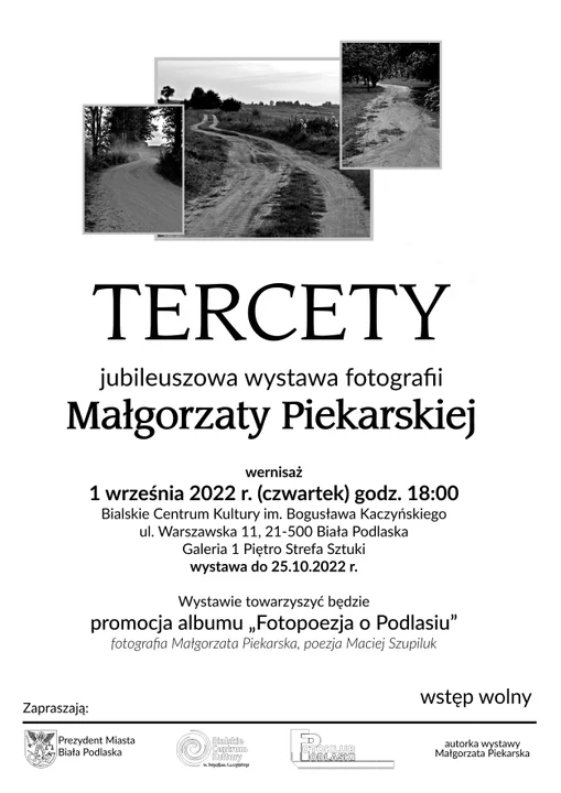 Wernisaż wystawy "Tercety" będzie miał miejsce 1 września (czwartek) o godz 18 w Bialskim Centrum Kultury im. Bogusława Kaczyńskiego przy ul. Warszawskiej 11 na pierwszym piętrze. Wystawa będzie dostępna do 25 października.
