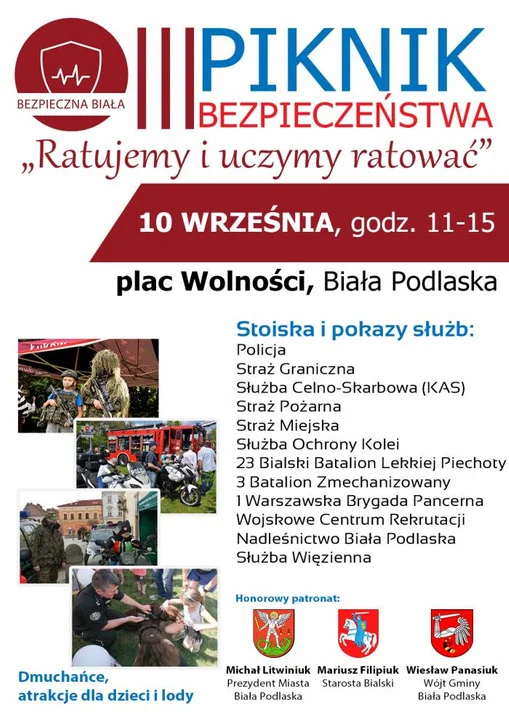 Piknik będzie miał miejsce w najbliższą sobotę (10 września) na bialskim placu Wolności. Organizatorem wydarzenia jest Stowarzyszenie Bezpieczna Biała.Na festynie swoje umiejętności i sprzęt zaprezentują: policja, straż graniczna, straż miejska, straż pożarna, służba ochrony kolei, służba celno-skarbowa (KAS), żołnierze z 23 Bialskiego Batalionu Lekkiej Piechoty,3 Batalionu Zmechanizowanego, 1 Wesołej Brygady Pancernej, Wojskowe Centrum Rekrutacji, Służba Więzienna oraz Nadleśnictwo Biała Podlaska. Na dzieci czekać będą dmuchańce, zabawy oraz lody.