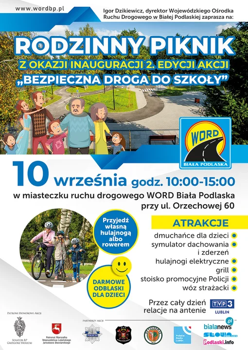 Wstęp na teren ośrodka i korzystanie ze wszelkich atrakcji tj. m.in. dmuchańce dla dzieci, symulatory dachowania oraz zderzeń, rowery, hulajnogi elektryczne na miasteczku ruchu drogowego będą całkowicie za darmo. Dodatkowo mieszkańcy, którzy zjawią się na pikniku otrzymają bezpłatnie elementy odblaskowe oraz materiały edukacyjne. Nad bezpieczeństwem na miasteczku i propagowaniem zasad bezpieczeństwa w ruchu drogowym czuwać będą egzaminatorzy z bialskiego WORD.