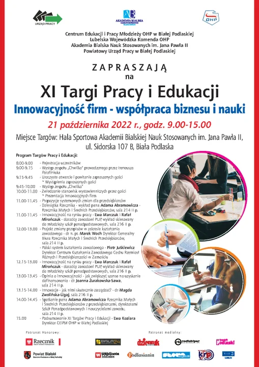 Targi będą miały miejsce 21 października w godz 9-15 w hali sportowej Akademii Bialskiej Nauk Stosowanych im. Jana Pawła II. Pojawią się stanowiska wystawiennicze firm. Będzie prezentacja innowacyjnych firm .Znalazło się również miejsce na m.in. wykład Adama Abramowicza, Rzecznika Małych i Średnich Przedsiębiorców oraz Ewy Marczuk i Rafała Mirończuka doradców zawodowych Powiatowego Urzędu Pracy. Wystąpi zespół "Chwilka", a całość wydarzenia pod koniec dnia podsumuje Ewa Koziara, dyrektor CEiPM OHP w Białej Podlaskiej.
