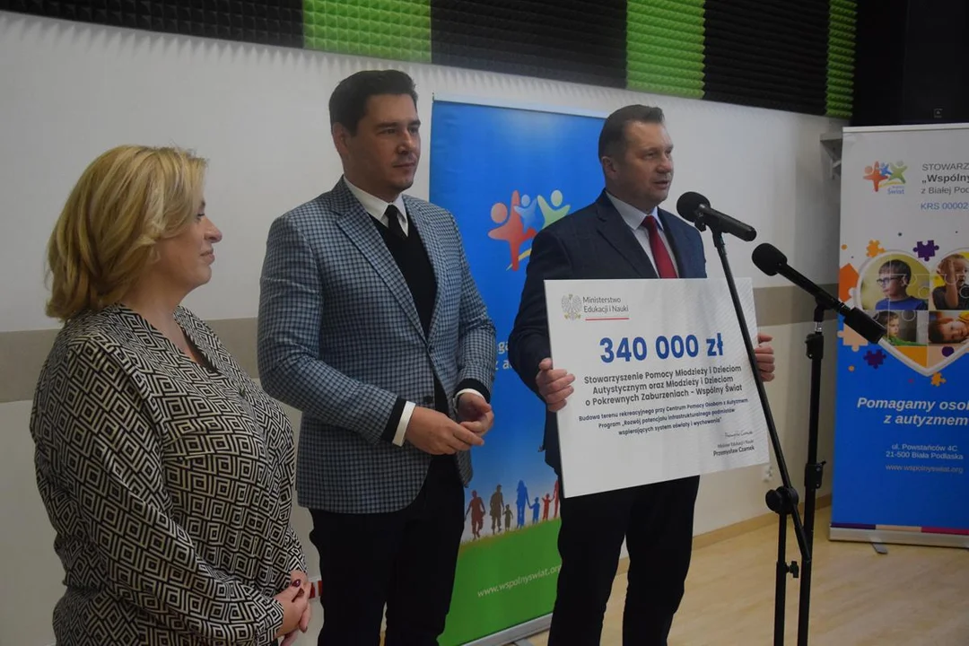 Podczas wizyty szef MEiN przekazał Centrum Pomocy Osobom z Autyzmem symboliczny czek na kwotę 340 tys. zł z programu.