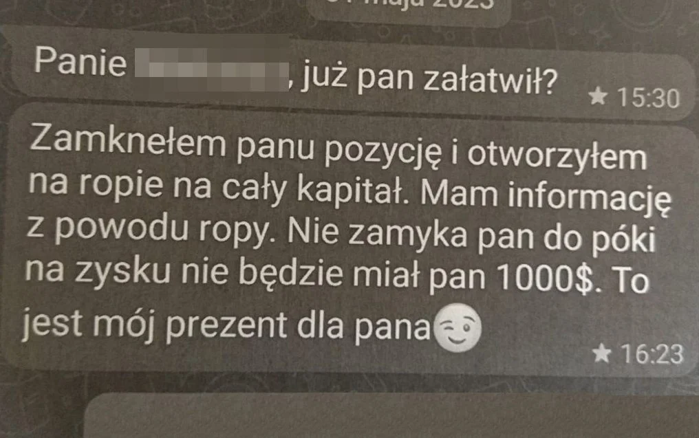 Przez kilka miesięcy na koncie inwestycyjnym 41-latka pojawił się zysk, więc postanowił wypłacić zarobione pieniądze. Okazało się, że pojawiły się dodatkowe opłaty, które mężczyzna musi ponieść by otrzymać wypracowany zysk. Początkowo miała być to prowizja brokerska za obsługę konta w wysokości 12 procent wypracowanego zysku.