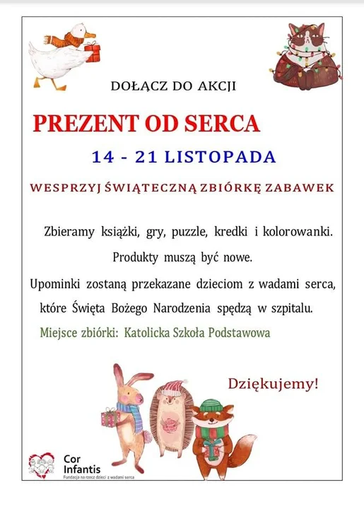 Akcja "Prezent od serca" potrwa jeszcze do 21 listopada. Zbierane są : książki, gry, puzzle, kredki i kolorowanki. Produkty muszą być nowe. Upominki zostaną przekazane dzieciom z wadami serca, które święta Bożego Narodzenia spędzą w szpitalu w Łodzi.