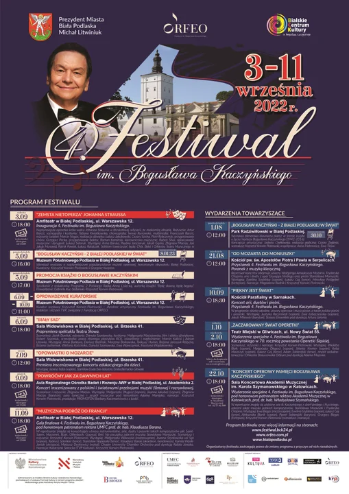 4.Festiwal im. Bogusława Kaczyńskiego w Białej Podlaskiej to święto muzyki operowej i operetkowej, które podbiło serca publiczności - mieszkańców miasta i gości. Wszystko to dzięki wysokiemu poziomowi artystycznemu, nietuzinkowej oprawie muzycznej oraz scenograficznej. Tegoroczna edycja festiwalu obejmować będzie występ najsłynniejszych solistów z Polski i z zagranicy.