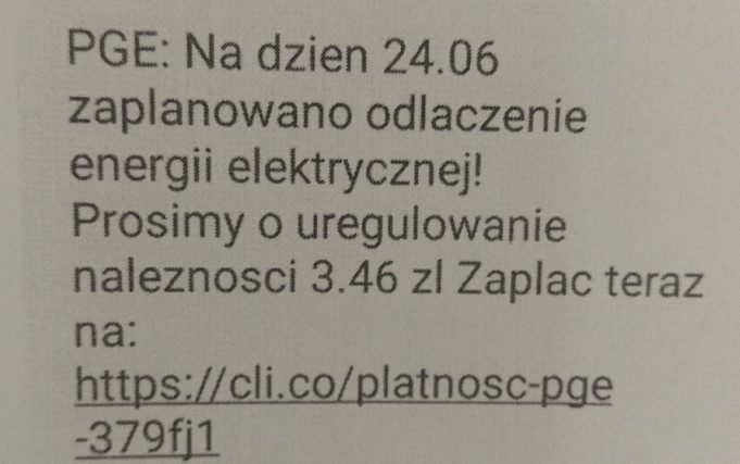 Wczoraj do bialskiej komendy zgłosił się 39-letni mieszkaniec gminy Biała Podlaska. Z jego relacji wynikało, że został oszukany. Pokrzywdzony otrzymał wiadomość SMS „PGE: Na dzień 24.06 zaplanowano odłączanie energii elektrycznej! Prosimy o uregulowanie należności. Podana była kwota do zapłaty w wysokości 3.46 złotych oraz link.