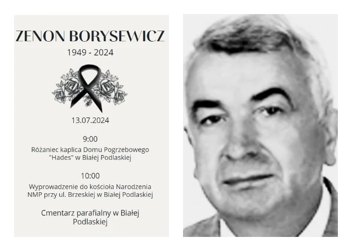 Śp. Zenon Borysewicz odszedł do wieczności. 13 lipca odbędą się uroczystości pogrzebowe. O godz. 9:00 w kaplicy Domu Pogrzebowego Hades w Białej Podlaskiej rozpocznie się różaniec. Na godz. 10:00 zaplanowano wyprowadzenie do kościoła Narodzenia NMP przy ul. Brzeskiej.