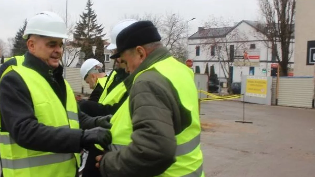 Zdj. Przed restauracją "U Starosty" starosta bialski Mariusz Filipiuk pomaga radnemu Czesławowi Pikaczowi założyć kamizelkę. Chodzi o przepisy BHP na budowie