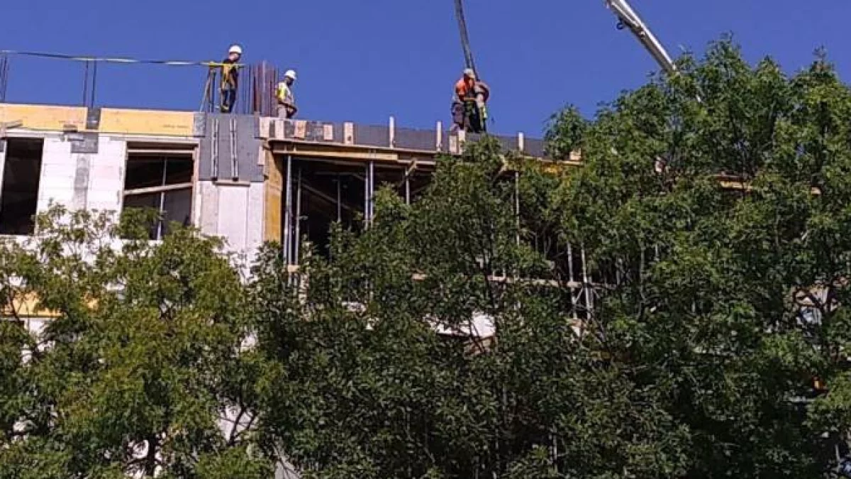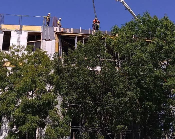 Teraz jednak, gdy już wystrzeliły w górę cztery kondygnacje, niepokoją powtarzające się sytuacje, gdy na budowie przy ciężkiej pracy - zalewaniu kolejnych elementów następnego piętra betonem - widać ludzi w czapkach. Obok nich stoją robotnicy (a może to inżynierowie...) w kaskach.