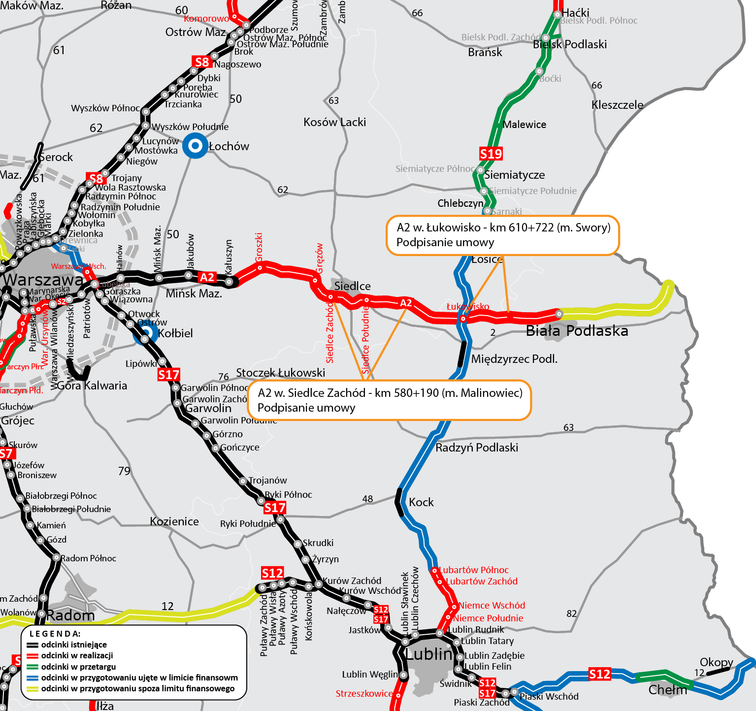 1 kwietnia br. GDDKiA podpisała umowy na dwa fragmenty A2 od Siedlec do Białej Podlaskiej: rejon miejscowości Malinowiec – węzeł Łukowisko oraz rejon miejscowości Swory – węzeł Biała Podlaska. W przypadku ostatniego 32-kilometrowego odcinka autostrady A2 od Białej Podlaskiej do granicy z Białorusią 3 lutego 2021 r. poznaliśmy oferty na wybór projektanta, który opracuje projekt budowlany i uzyska niezbędne decyzje umożliwiające realizacje robót w terenie. Kolejnym etapem będzie ogłoszenie przetargu na realizację inwestycji.