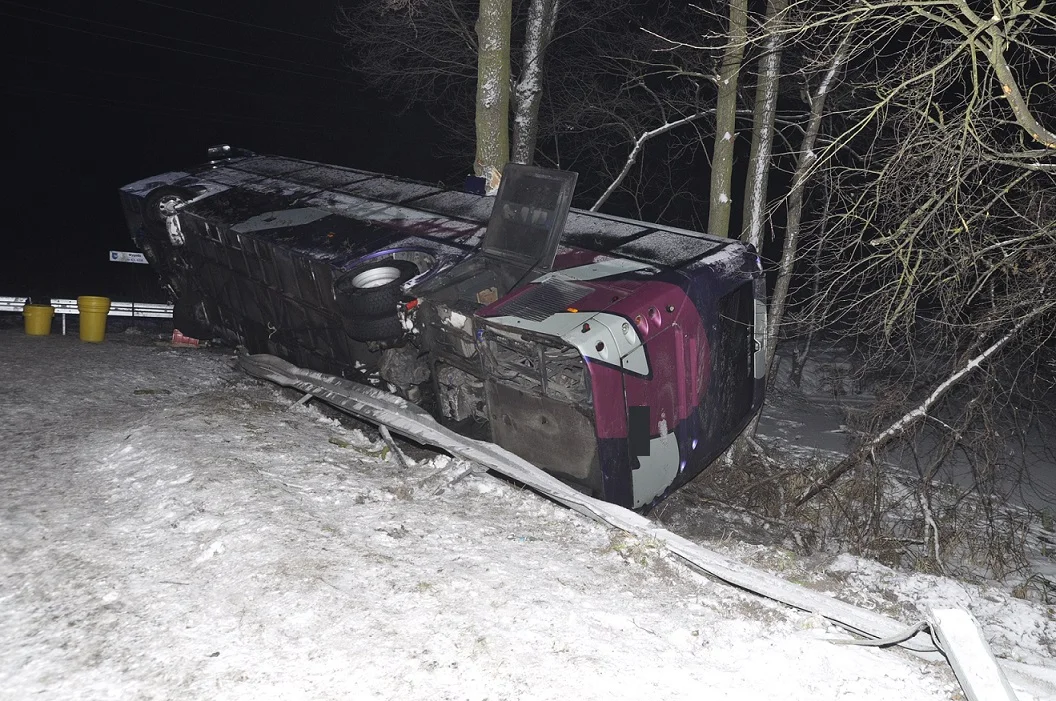 - Ze wstępnych ustaleń wynika, 63-letni kierowca jadąc z Białej Podlaskiej, na łuku drogi wpadł w poślizg, zjechał na prawe pobocze i uderzył w bariery energochłonne. Po tym autokar przewrócił się na bok i uderzył w przydrożne drzewo. 63-latek prawdopodobnie nie dostosował prędkości do trudnych warunków panujących na drodze. Kierowca autokaru był trzeźwy. Potwierdziło to przeprowadzone przez mundurowych badanie - informuje nadkomisarz Barbara Salczyńska-Pyrchla z KMP w Białej Podlaskiej.