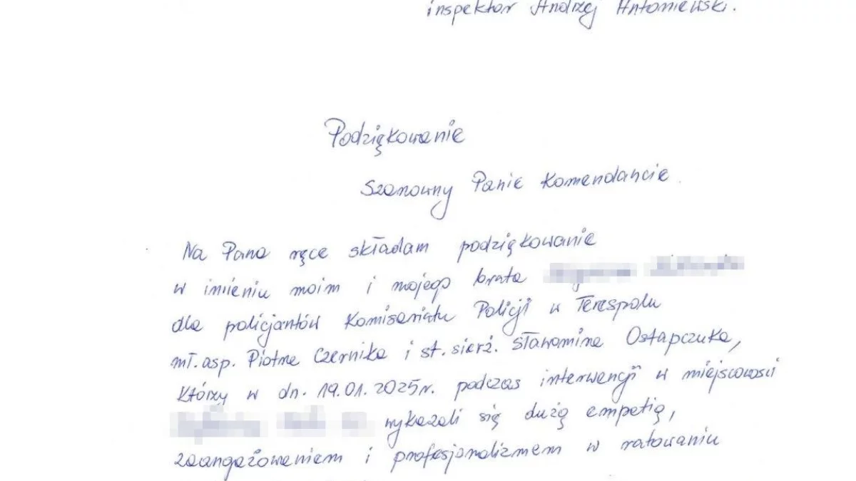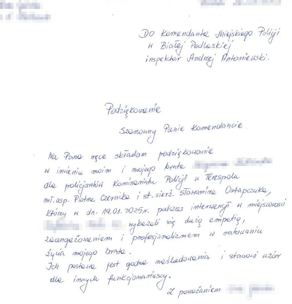 Na ręce Komendanta Miejskiego Policji w Białej Podlaskiej, insp. Andrzeja Antoniewskiego wpłynęły podziękowania dla policjantów terespolskiego komisariatu mł. asp. Piotra Czernika oraz st. sierż. Sławomira Ostapczuka,
