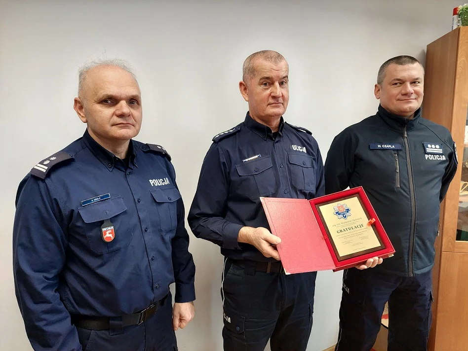 W czwartek (11 stycznia) Komendant Miejski Policji w Białej Podlaskiej insp. Wojciech Czapla wraz z Komendantem Komisariatu w Terespolu mł. insp. Krzysztofem Gdulą wręczyli jubilatowi pamiątkowy grawerton. Podziękowali też za lata rzetelnej i ofiarnej służby dla społeczeństwa. Podkreślili zaangażowanie i wzorowe wypełnianie przez niego obowiązków służbowych. Jednocześnie życzyli dalszych sukcesów zawodowych, pomyślności oraz szczęścia w życiu osobistym. Do życzeń i gratulacji dołączył Zastępca Komendanta terespolskiego komisariatu nadkom. Robert Górski oraz bezpośredni przełożony funkcjonariusza tj. Naczelnik Wydziału Prewencji podkom. Szymon Markowski.