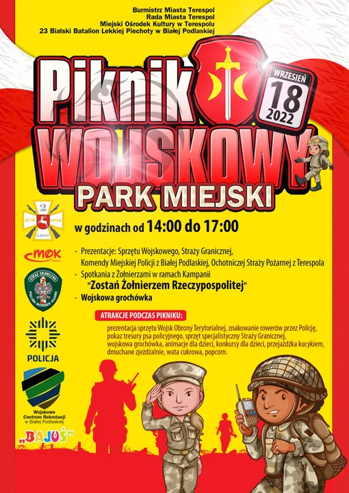Podczas pikniku będą atrakcje dla dzieci: dmuchańce, kucyk, wata, popcorn, animacje dla dzieci, konkursy. Dodatkowo podczas wydarzenia będzie wydawana grochówka wojskowa.