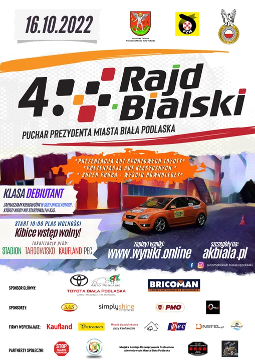 KJS 4 Rajd Bialski rozgrywany jest także jako 2 Runda Samochodowych Mistrzostw Automobilklubu Bialskopodlaskiego i 5 Runda Pucharu Prezesa Automobilklubu Bialskopodlaskiego. Wystartować może każdy posiadacz prawa jazdy kategorii B. Specjalnie z myślą o osobach chcących spróbować swoich sił pierwszy raz utworzono "klasę debiutant", do której trafią tylko seryjne auta kierowane przez osoby nie klasyfikowane dotychcasz w rajdach. Zapisy na stronie www.wyniki.online.Szczegółowe informacje na stronie organizatora Automobilklubu Bialskopodlaskiego.