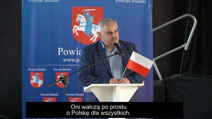 Z chorągiewką na trybunie jako pierwszy pojawił się radny Arkadiusz Maksymiuk (PSL).