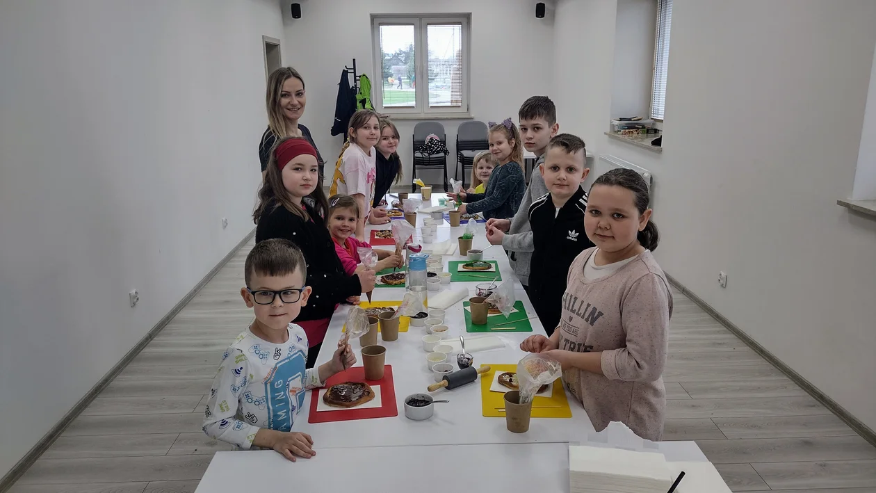 W zajęciach wzięło udział blisko 30 dzieci, które miały okazję własnoręcznie przyrządzić wielkanocnego mazurka. Najpierw ugniatanie, formowanie potem pieczenie, smarowanie dżemem a na koniec miała miejsce dekoracja różnokolorową czekoladą, migdałami, orzeszkami, skórką pomarańczy i kolorową posypką. Pięknie zdobione ciasta dzieci zabrały ze sobą aby 2 kwietnia z kolej odbył się kiermasz wielkanocny, podczas którego swoje wyroby wystawiła na sprzedaż pracownia plastyczno-ceramiczna kierowana przez Marcelinę Łozak-Ładę (anioły, jaja, króliki, baranki, kubki, filiżanki, miseczki, świąteczne kartki) oraz pracownia tkacko-krawiecka, którą opiekuje się Janusz Turecki (kurczaki, zające, obrazki z wyszywankami, filcowe torby).