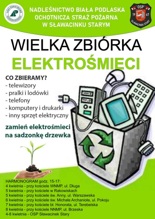 Wspólnie z gminą Biała Podlaska i Nadleśnictwo Biała Podlaska oraz Lasy Państwowe, OSP Sławacinek Stary organizuje po raz kolejny zbiórkę elektrośmieci.