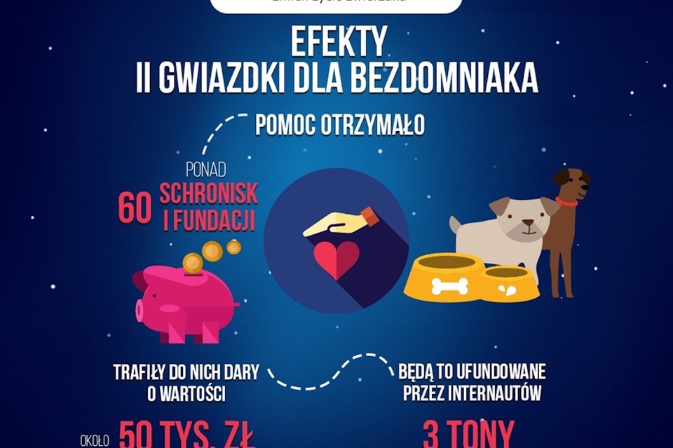 Na czym dokładniej polegała „Gwiazdka dla bezdomniaka”? Najpierw na platformie www.dlaSchroniska.pl fundacje i schroniska zamieściły informacje na temat potrzebnej przebywającym pod ich opieką czworonogom karmy, a następnie internauci sami wybierali, który podmiot i iloma kilogramami chcą wesprzeć. Darczyńcy nie musieli przejmować się kosztami dostawy, bo te pokrywali organizatorzy.
