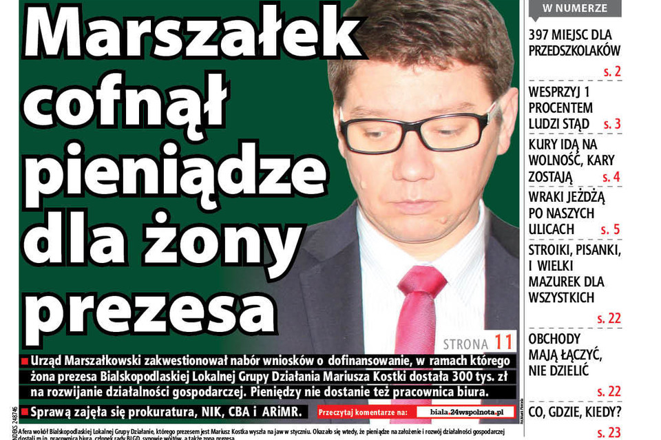 W artykule "Sami swoi, czyli kto unię "doi"..." (nr 4 "Wspólnoty Bialskiej" z 24 stycznia) przedstawiliśmy kontrowersyjny wynik podziału dotacji unijnych w Bialskopodlaskiej Lokalnej Grupie Działania. Opisaliśmy oburzenie ludzi na przydzielenie po 100-300 tys. zł dofinansowania m.in. synom wójtów oraz członkom i pracownicy BLGD. W grupie "Rozwijanie działalności gospodarczej" beneficjentką została żona prezesa, jej firmie przyznano 300 tys. zł. Po naszym artykule nastąpiły zdecydowane działania w Urzędzie Marszałkowskim. Sprawę kontrolują ARiMR, NIK i CBA; a UM odmówił przyznania funduszy trzem osobom.