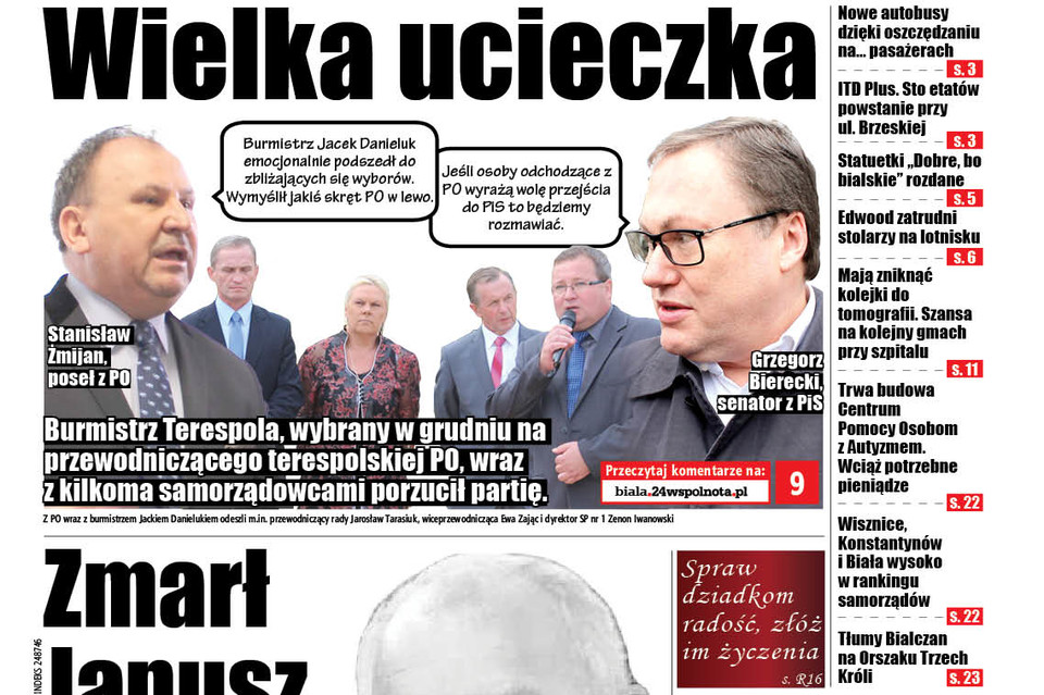 Paradoksalnie, we wrześniu 2014 r. na konwencji wyborczej Dariusza Stefaniuka startującego na bialskiego prezydenta serdecznie witany był właśnie Jacek Danieluk, który wspierał kandydata PiS. W tymże miesiącu senator Grzegorz Bierecki (PiS) i poseł Stanisław Żmijan uczestniczyli obok siebie w uroczystym otwarciu nowego przedszkola. Przez lata wydawało się, że właśnie nad Bugiem jest zawiązany tajemny węzeł PO-PiS..., który owocował nieformalną koalicją w mieście Biała Podlaska i nawet w powiecie bialskim (z udziałem PSL).