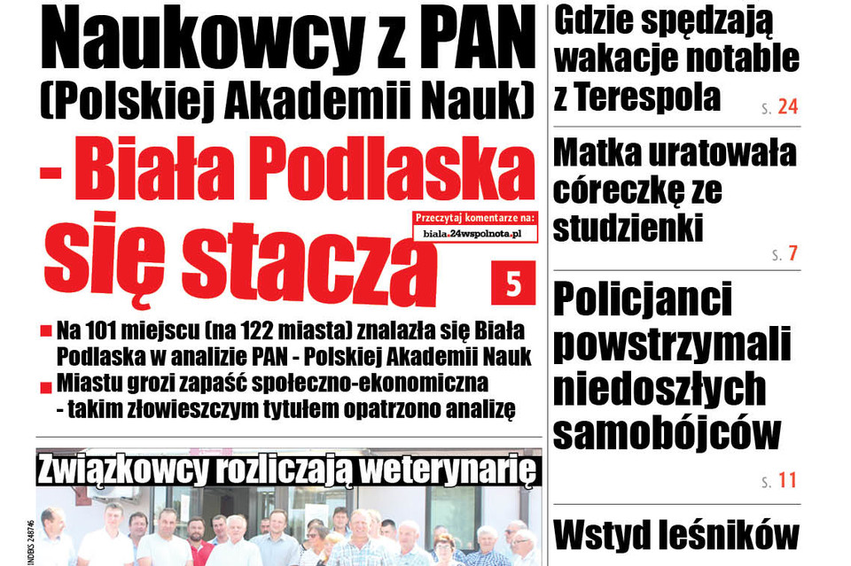 Polska Agencja Prasowa ogłosiła analizę opracowaną przez Instytutu Geografii i Przestrzennego Zagospodarowania PAN, opatrując ją złowieszczym tytułem "122 miastom grozi zapaść społeczno-ekonomiczna". W rankingu przygotowanym przez naukowców znalazła się Biała Podlaska. Na 101. pozycji w grupie "utrata funkcji-niekorzystna sytuacja społeczno-gospodarcza", zaczynającej się od miejsca 85. Wyżej w całym zestawieniu są Chełm i Zamość. Zajmują odpowiednio 12. i 14. miejsce i zakwalifikowano je do najgorszej kategorii "silna utrata funkcji, mocno niekorzystna sytuacja społeczno-ekonomiczna". Byłe miasta wojewódzkie wciąż odczuwają skutku degradacji - utraty przywilejów i funkcji przewodzenia w swoich mikroregionach oraz coraz mocniej zauważalne są wyludnianie i odpływ młodych wykształconych mieszkańców do dużych miast. W rankingu są mniejsze miasta Lubelszczyzny jak Tomaszów Lubelski, Krasnystaw, Biłgoraj, Hrubieszów, a z naszych okolic Radzyń Podlaski. Nie ma natomiast Międzyrzeca Podlaskiego.