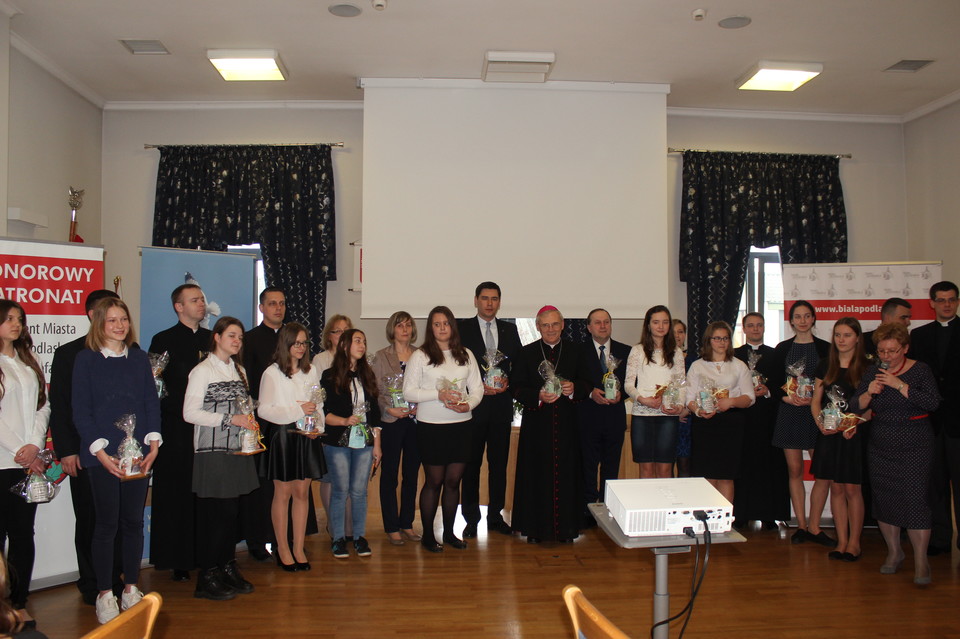 Nagrody wręczali m.in. sprawujący honorowy patronat nad konkursem: ordynariusz diecezji siedleckiej ks. biskup Kazimierz Gurda i bialski prezydent Dariusz Stefaniuk oraz nowy wicestarosta bialski Janusz Skólimowski. Ponadto sześć pierwszych gimnazjalistek otrzymało od Stanisławy Duklewskiej z Towarzystwa Przyjaciół Dzieci nagrodę w postaci sfinansowania wyjazdu wycieczkowo-pielgrzymkowego (nie określono miejsca). Finalistkom wręczono też upominki m.in. od „Caritasu” oraz nagrody książkowe od ich parafii. Aż trudno uwierzyć, że od kilkunastu lat tak duży konkurs przygotowuje i organizuje katechetka Barbara Wysokińska, której serdecznie podziękował ordynariusz. Ks. biskup Kazimierz Gurda powiedział nam, że chciałby, aby tak udana impreza miała zasięg diecezjalny.