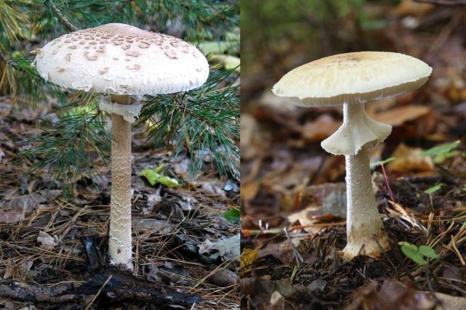 Jadalna kania z lewej i trujący muchomor cytrynowy z prawej. Te grzyby trzeba umieć odróżnić, bo zatrucie muchomorem może źle się skończyć