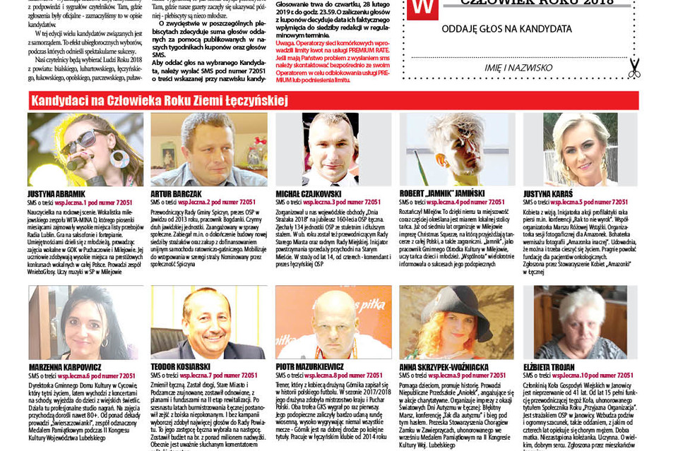 Aby oddać głos na wybranego Kandydata, należy wysłać SMS pod numer 72051 o treści wskazanej przy nazwisku kandydata (koszt SMS: 2,46 zł z VAT) lub dostarczyć do naszej redakcji (adres w stopce redakcyjnej) wypełniony kupon.