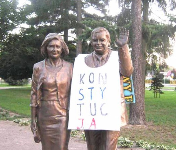 Koszulka z napisem "konstytucja" pojawiła się na postaci Lecha Kaczyńskiego 2 sierpnia około godz 5:00. W parku przy placu Wojska Polskiego w Białej Podlaskiej usytuowany jest pomnik pary prezydenckiej. Godzinę później kamizelkę na pomniku zauważyli patrolujący park policjanci. Natychmiast ją zdjęli i zabezpieczyli monitoring. Zarzut znieważenia pomnika usłyszał Stanisław Dembowski, 67-letni mieszkaniec gminy Biała Podlaska, działacz KOD. Po przesłuchaniu został zwolniony do domu. Zgodnie z obowiązującym kodeksem karnym, może grozić mu kara grzywny lub ograniczenia wolności. Policjanci przyszli do domu Ryszarda Filipiuka, ale go nie zastali.