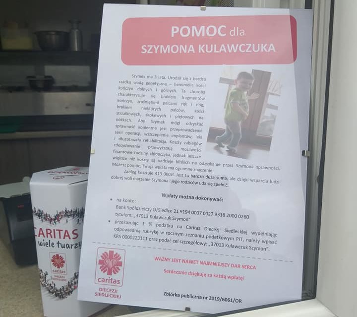 KulturaDziś, tj. 19 lutego w Barze Kebab przy ul .Jana 3 Sobieskiego 72, trwa zbiórka na operację Szymonka Kulawczuka z Przegalin Dużych, który urodził się ze zdeformowanymi nóżkami i rączkami, a szansą na lepsze życie jest dla niego kosztowna operacja. Chłopczyk potrzebuje zebrać dużą kwotę prawie 500 tysięcy złotych, żeby poddać się operacji, dającej szansę na normalne poruszanie się.
