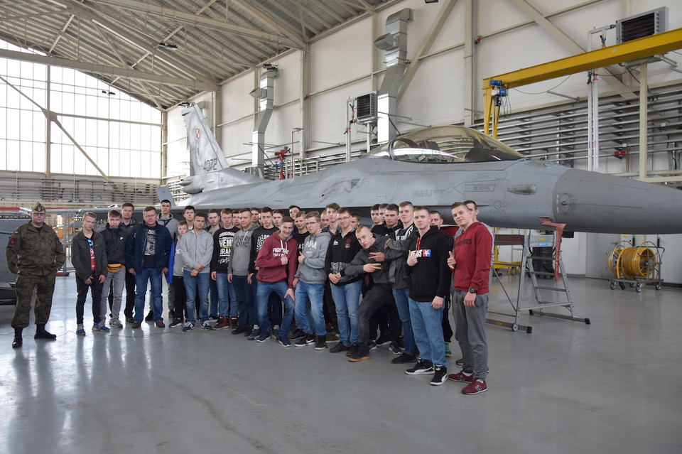 Ostatnim i najbardziej wyczekiwanym punktem programu zwiedzania bazy lotniczej był hangar z samolotami wielozadaniowymi "Falcon" F-16. Uczniowie dowiedzieli się, że 31 Baza Lotnictwa Taktycznego jest w posiadaniu 32 „Jastrzębi" z czego dwa pełnią obecnie misję poza granicami naszego państwa. Dodatkową atrakcją była możliwość obserwowania procedury kołowania i startu 12 samolotów F-16.