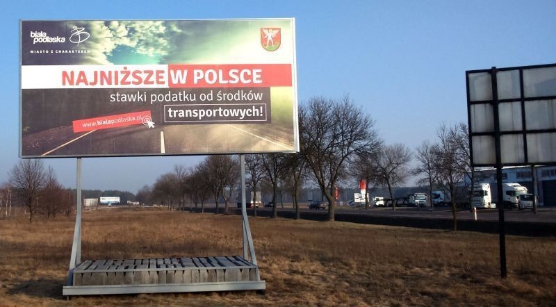 To nie koniec działań bialskiego magistratu. Rozpoczęliśmy kampanię promocyjną „Biała Podlaska – najniższe w Polsce stawki od środków transportowych”. Na miejskich nośnikach usytułowanych na obwodnicy miasta pojawiły się dwa billboardy. Już wkrótce podobne pojawią się na obrzeżach części miast w województwie lubelskim, mazowieckim i podlaskim. Planujemy także reklamę w prasie specjalistycznej. Do rejestrowania pojazdów zachęcamy także na naszej stronie internetowej oraz w portalach społecznościowych