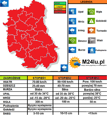 Synoptycy portalu M24lu.pl ostrzegają, że wyładowaniom atmosferycznym mają towarzyszyć intensywne opady deszczu, silne gradobicia oraz silny wiatr, który w porywach będzie osiągać lokalnie ponad 100 km/h. Niespokojnie będzie w całym województwie lubelskim!. Do gwałtownych zjawisk atmosferycznych dojdą także upały. Dzisiaj (17 czerwca 2016 r.) temperatura wzrośnie nawet do 33 stopni Celsjusza. Niestety podczas burz istnieje duże ryzyko pojawienia się trąb powietrznych!