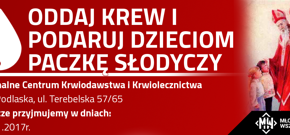 Akcja odbędzie się w dniach 5-6 grudnia (wtorek-środa) 2017 roku i polegać będzie na zbiórce czekolad w Regionalnym Centrum Krwiodawstwa i Krwiolecznictwa przy ul. Terebelskiej 57/65 w Białej Podlaskiej, które można otrzymać za oddanie krwi.
