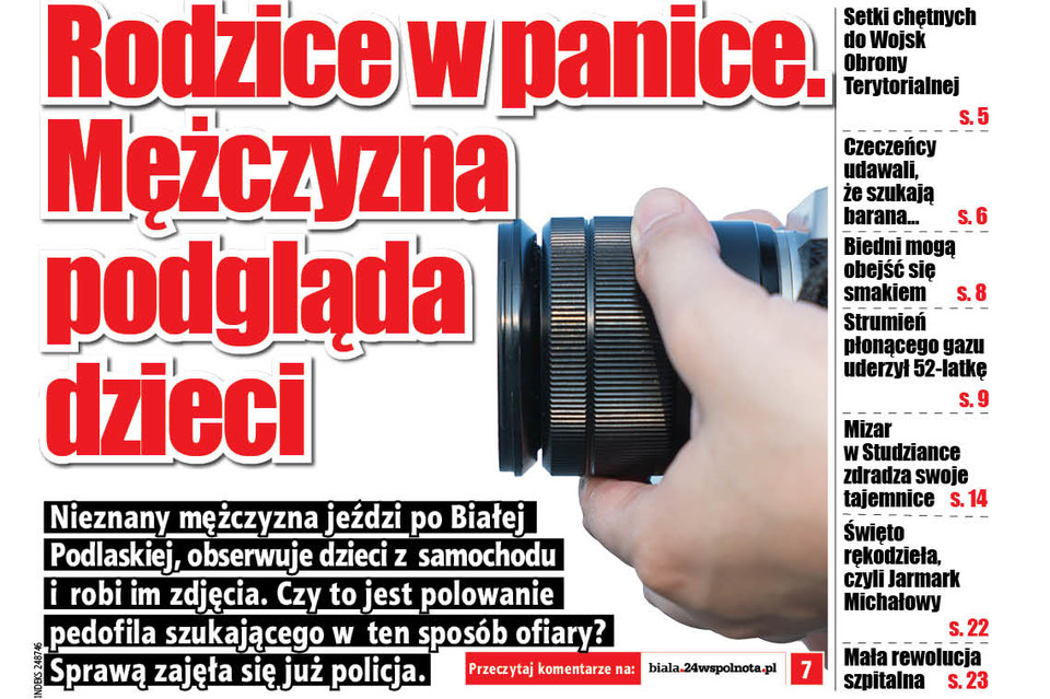 Ostrzegający przed zagrożeniem wpis na portalu społecznościowym z połowy września zelektryzował rodziców. W poście, udostępnionym przez 95 internautów, jest mowa o mężczyźnie, który porusza się po Białej Podlaskiej fiatem punto, obserwuje dzieci i robi im zdjęcia. Nie zaczepia, nie próbuje rozmawiać, ale niepokój o to, do czego może się posunąć, narasta. - Mojej córce zrobił wczoraj zdjęcie, zapamiętała numery, zgłaszam to na policję - napisała w komentarzu pod postem matka dziecka. W kolejnym wpisie podała markę samochodu potem numery rejestracyjne. Według niej był to fiat ducato. - Zgłosiłam sprawę policji, niech oni się zajmą - potwierdza kobieta, z którą skontaktowaliśmy się na portalu.