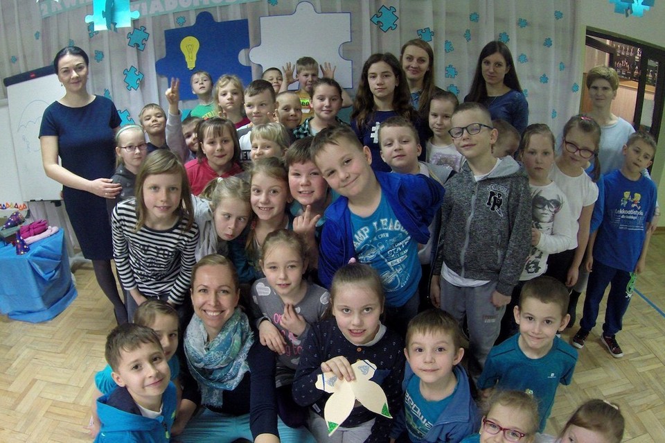 W dalszej części mgr Małgorzata Suszczyńska – oligofrenopedagog i terapeuta Wczesnego Wspomagania Rozwoju Dziecka – odczytała dzieciom bajki terapeutyczne, których bohaterami były osoby z autyzmem i Zespołem Aspergera. Dyskusję oraz quiz tematyczny, obalające mity i podkreślające fakty związane ze spektrum autyzmu poprowadziła mgr Krystyna Pomorska. Psycholog behawioralna zaprezentowała młodzieży klas 4-6 także film animacyjny oraz nagranie video z przesłaniem od pani Katarzyny Gotlin, która jest dorosłą osobą z zespołem Aspergera. Ta niezwykle uzdolniona kobieta ukończyła studia informatyczne, na co dzień zajmuje się programowaniem oraz tłumaczeniem tekstów. Jej pasją są języki germańskie i fotografowanie starych cmentarzy. Całą ścieżkę edukacyjną przeszła w szkołach ogólnodostępnych. Nigdy nie miała problemów z nauką, dużo gorzej było jednak z kontaktami społecznymi. Z biegiem czasu radziła sobie coraz lepiej w neurotypowym świecie, ale wciąż wyraźnie odczuwa swą odmienność. Swoimi doświadczeniami dzieli się na blogu „Koci Świat ASD”, uczestniczy też w różnych projektach. Chciałaby, żeby jej działalność pomogła w lepszym zrozumieniu osób ze spektrum autyzmu. Nasza młodzież z dużym entuzjazmem i zrozumieniem przyjęła przesłanie od pani Katii.