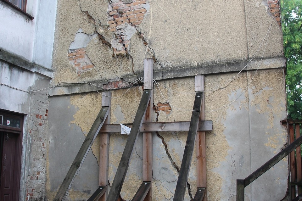 Część niezamieszkała przez pewien czas należała do Zakładu Gospodarki Lokalowej. Trzy miesiące temu zamontowano podporę, która ma podtrzymywać ścianę przed osunięciem się. Nasz rozmówca zauważył jak ściana - pomimo zamontowania podpory - zaczęła się delikatnie zsuwać, czego nie widać było jeszcze parę miesięcy temu. Sytuacja jest poważna: w pobliżu często bawią się dzieci, które mogą być nieświadome zagrożenia.