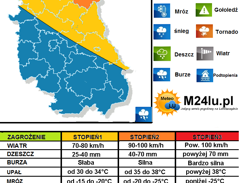 Prognozuje się wystąpienie burz z opadami deszczu od 30 mm do 40 mm, lokalnie 50 mm, oraz porywami wiatru do 100 km/h. Lokalnie spodziewane są opady gradu o średnicy do 2-3 cm.