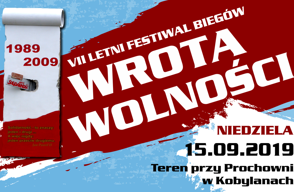 Z radością objęliśmy patronatem medialnym siódmą już edycję Letniego Festiwalu Biegów "WROTA WOLNOŚCI", który odbędzie się 15 września 2019 roku przy Prochowni w Kobylanach. Impreza z roku na rok cieszy się coraz większym zainteresowaniem. W sąsiedztwie "mety" znajduje się pomnik "Wrota Wolności" składający się z trzymetrowego fragmentu muru berlińskiego - symbolu podziału Europy - oraz wmurowanej cegły ze Stoczni Gdańskiej, kolebki Solidarności. Przesłaniem wydarzenia jest łączenie, integracja i wzajemny dialog pokoleń w myśl słów Jana Pawła II: "Solidarność - to znaczy: jeden i drugi, a więc nigdy: jeden przeciwko drugiemu".