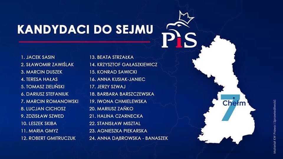 Prezentujemy pełną listę kandydatów do sejmu z okręgu nr 7 (obejmującym powiat bialski i miasto Biała Podlaska). Wśród polityków powiatu bialskiego trzecie miejsce należy do Marcina Duszka. Na szóstym miejscu znajduje się z kolei Dariusz Stefaniuk, były prezydent Białej Podlaskiej, wicemarszałek województwa lubelskiego. Na dwunastym miejscu pojawił się wicewojewoda lubelski, Robert Gmitruczuk, z kolei na miejscu osiemnastym znajduje się Barbara Barszczewska.