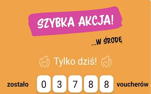 Karta z „Szybką akcją" pojawia się w ciągu dnia w każdą środę na głównej stronie aplikacji. Znajduje się na niej przycisk „Chcę to!" – należy go wybrać, a następnie jednorazowo zaakceptować regulamin akcji i ponownie potwierdzić chęć zdobycia vouchera.