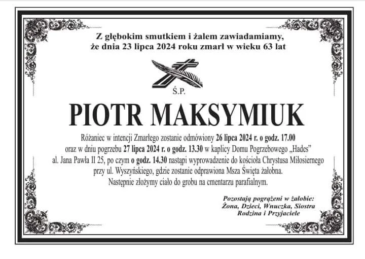 Różaniec w intencji zmarłego zostanie odmówiony 26 lipca o godz. 17:00 oraz w dniu pogrzebu 27 lipca o godz. 13:30 w kaplicy Domu Pogrzebowego "Hades" (ul. Jana Pawła II 25). O godz. 14:30 nastąpi wyprowadzenie do kościoła pw. Chrystusa Miłosiernego przy ul. Wyszyńskiego, gdzie zostanie odprawiona msza święta żałobna. Ciało zostanie złożone do grobu na cmentarzu parafialnym.