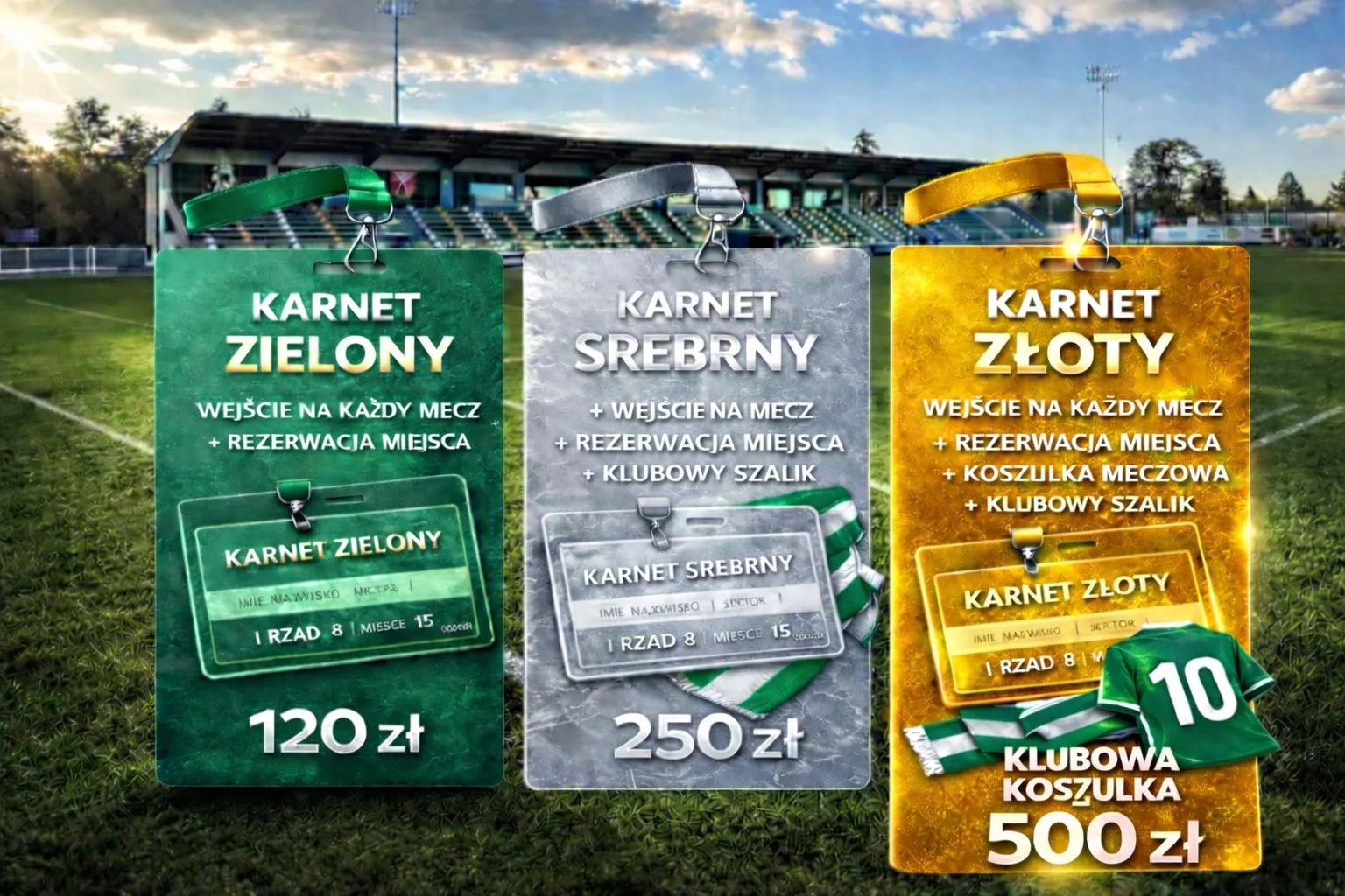 Karnet Złoty - 500 zł: wejście na każdy mecz, rezerwacja miejsca, klubowy szalik oraz koszulka meczowa.