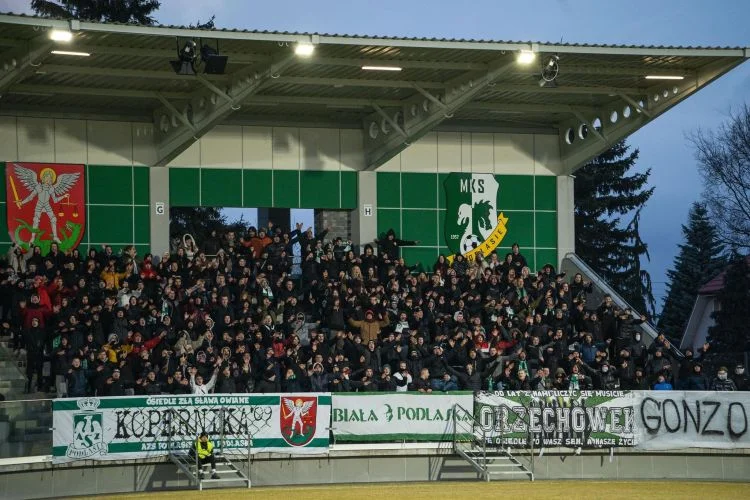 A na nim trzech zawodników Podlasia Biała Podlaska: Erwin Bahonko, Tomasz Andrzejuk, Jarosław Kosieradzki. Po prawej stronie można ujrzeć najzagorzalszych fanów biało-zielonych podczas starcia z Wieczystą Kraków. A na górze: Dziękujemy za wsparcie i herby Podlasia oraz miasta!