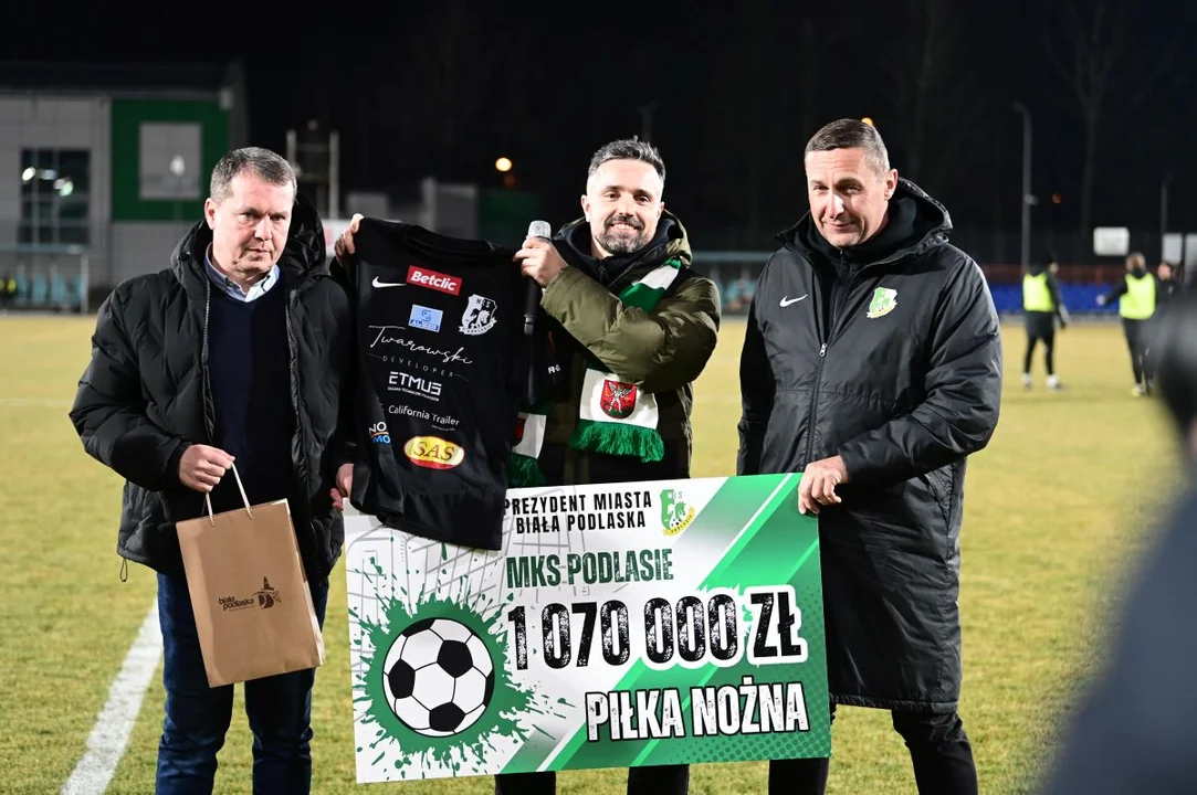 Prezydent Michał Litwiniuk przekazał symboliczny czek na wspieranie klubu z Białej Podlaskiej. Opiewał na kwotę 1 070 000 zł! Czek odebrali: prezes Podlasia Biała Podlaska Tomasz Buraczewski oraz trener - koordynator drużyn młodzieżowych Miłosz Storto. Sternik miasta otrzymał od władz klubu koszulkę z numerem 99.