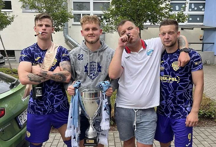 Maciej Wojczuk (pierwszy z lewej) oraz Sebastian Johnson (drugi z prawej) świętują awans do IV ligi wielkopolskiej