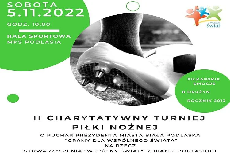 Kacper Barszcz oraz AP Podlasie Biała Podlaska zorganizują II Charytatywny Turniej Piłki Nożnej o puchar prezydenta Białej Podlaskiej "Gramy dla Wspólnego Świata" na rzecz Stowarzyszenia Wspólny Świat" z Białej Podlaskiej.