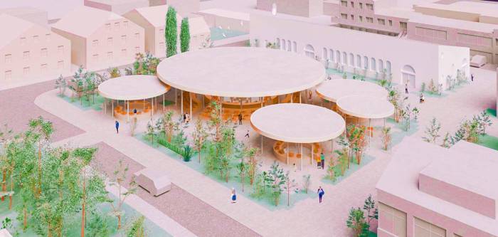 Na terenie wyznaczono drogi o szerokości 5 m, a pozostałą powierzchnia to plac targowy wraz z dojściami do hali targowej. Na placu przewidziano też zieleńce oraz 4 wiaty targowe w kształcie okręgów. Na odnowionym targowisku będą 42 stanowiska handlowe w formie stanowisk z blatami i wystawkami kaskadowymi oraz stołów wielofunkcyjnych.W centralnej części zadaszenia zaprojektowany zostanie stół, który będzie używano jako stolik szachowy.Miejsca postojowe są zlokalizowane od strony północnej oraz nowe od strony ul. Wąskiej, gdzie zaprojektowano dziewięć dodatkowych miejsc. Przebudowany zostanie też budynek, w którym dawniej mieścił się sklep "Społem". Zostanie dostosowany do targowiska. Będzie piętnaście miejsc dla kupców, będzie to też miejsce wypoczynku, zaplecze socjalno-sanitarne oraz śmietnik.
