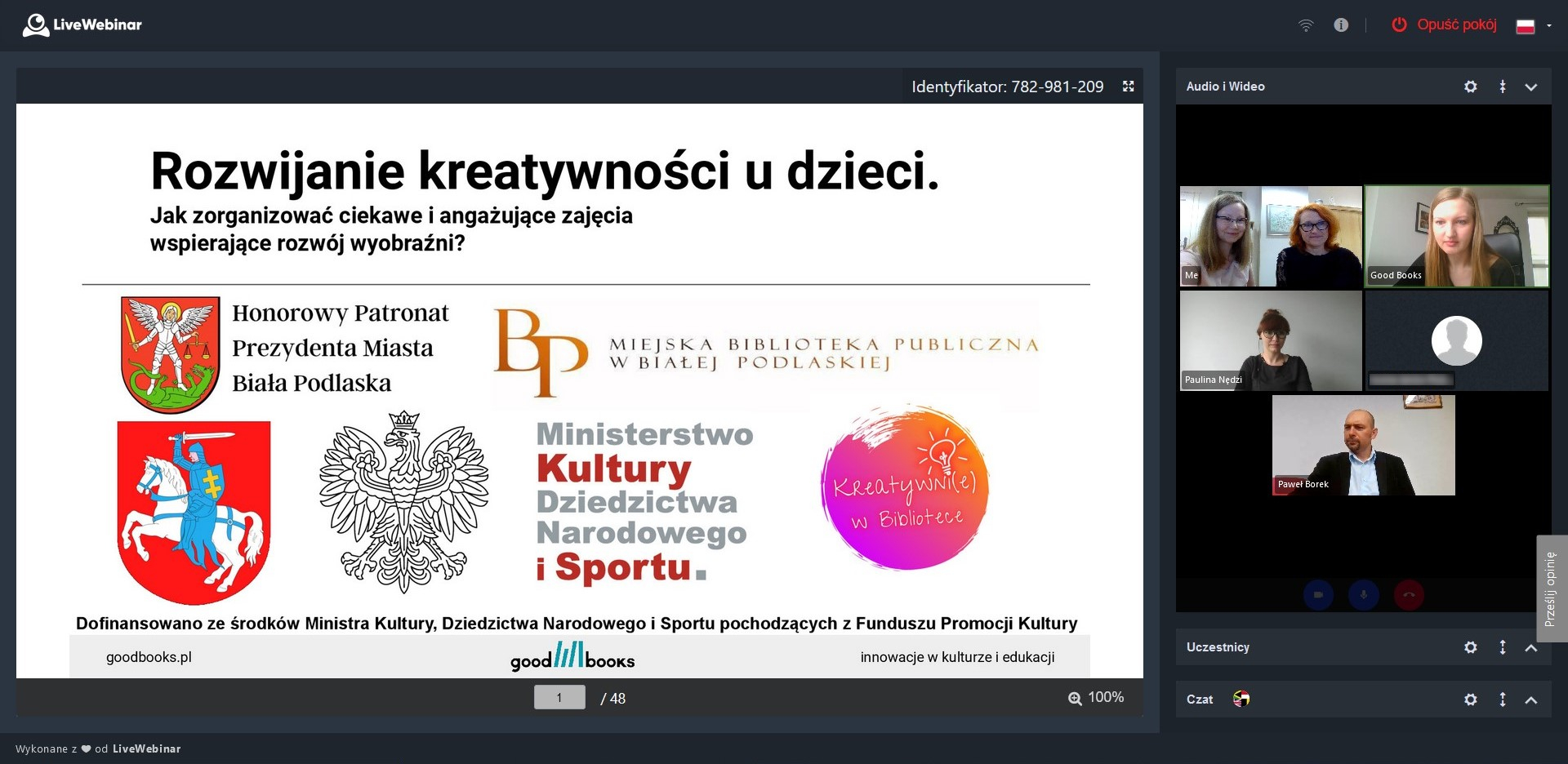 Podczas pierwszego szkolenia 13 i 14 maja 2021 r., którego tematem było ”Rozwijanie kreatywności u dzieci. Jak zorganizować ciekawe i angażujące zajęcia wspierające rozwój wyobraźni”, bibliotekarze poznali sposoby rozwijania zachowań twórczych u najmłodszych na każdym etapie rozwoju, metody i źródła inspiracji.